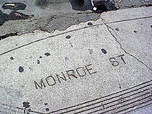 Other points to ponder: Monroe Street was paved in concrete rather than asphalt, because of its steepness. It was thought that the tar might run before it had a chance to set up properly. In addition, the Bush Street end of Monroe is about a hundred yards from the mouth of Burritt Alley. Hammett placed Miles Archer's murder at this location in The Maltese Falcon.